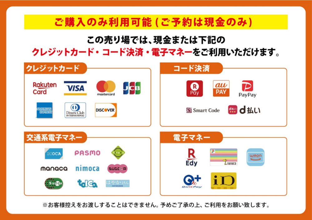 ※クレジットカード、交通系IC、QR決済は通信障害などが発生した場合はご利用いただけないことがございます。予めご了承ください。